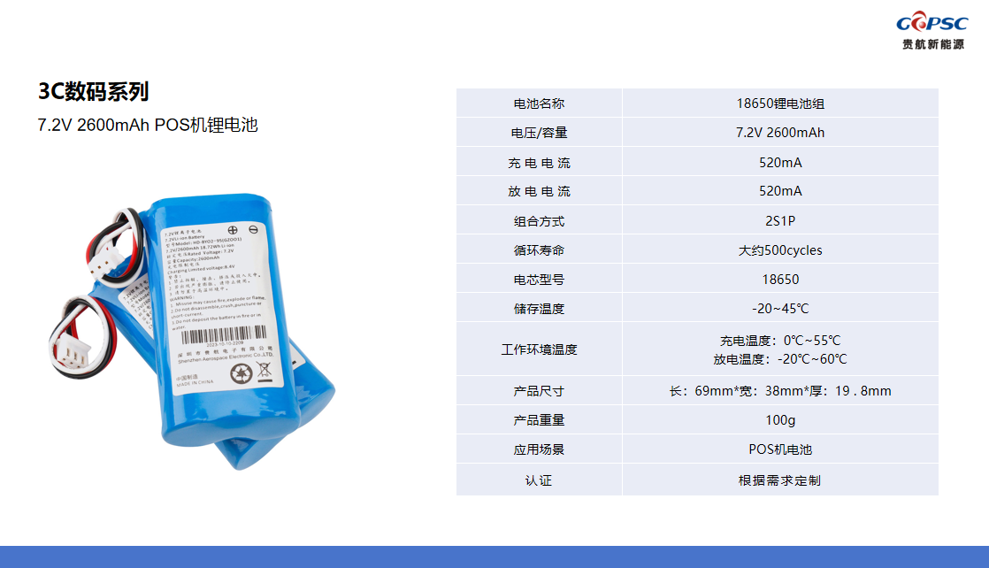 7.2V 2600mAh POS机锂电池